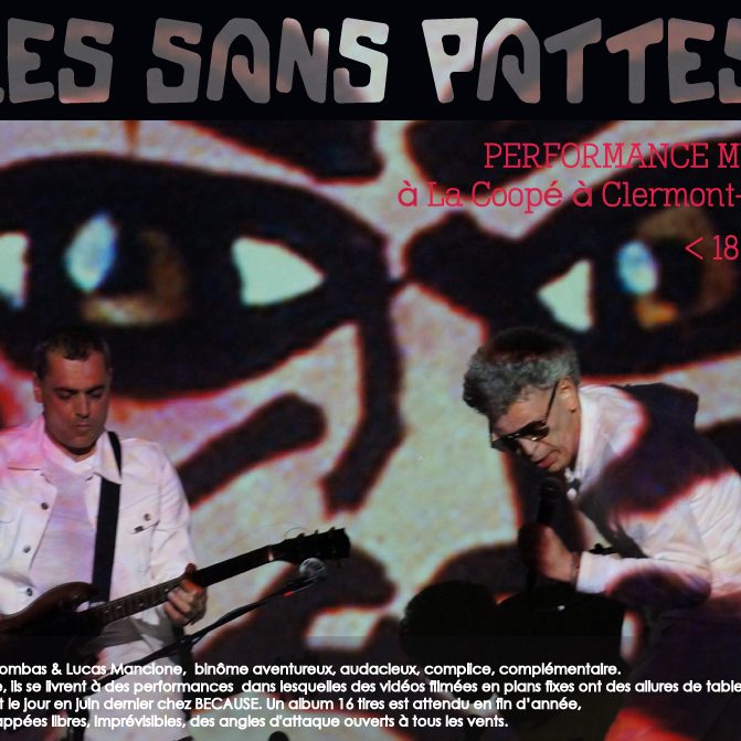 DetailsArticle publié dans le journal LA MONTAGNE : http://www.lamontagne.fr/clermont-ferrand/loisirs/art-litterature/2016/11/18/combas-l-art-du-mouvement_12158145.html Reportage France 3 Auvergne Concert des Sans Pattes à la Coopérative de Mai de Clermont-Ferrand 18 novembre 2016 à 23h rue Serge-Gainsbourg 63100 Clermont-Ferrand http://www.lacoope.org/actu/robert-combas-et-lucas-mancione https://www.facebook.com/events/813011082134990/ http://www.unidivers.fr/rennes/concert-les-sans-pattes-robert-combas-et-lucas-mancione/